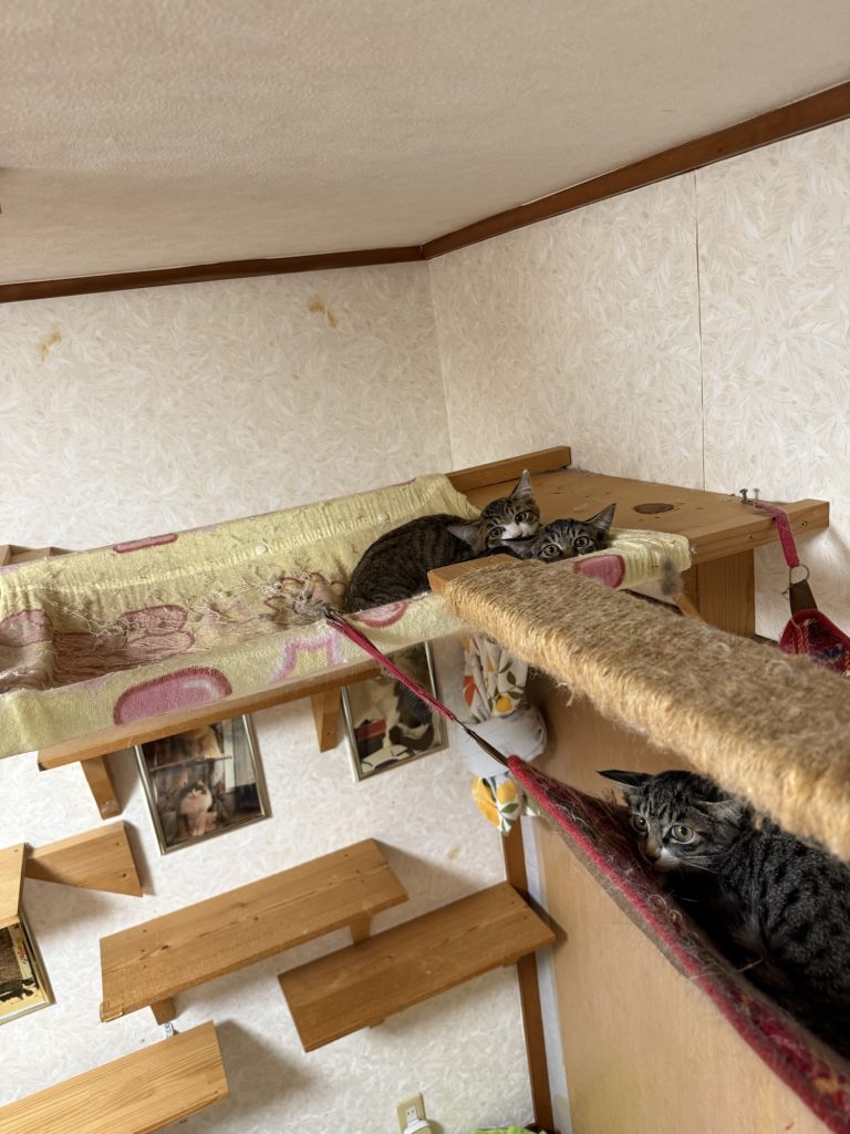 保護主さんが帰られた後、もう一度覗きに行くと1匹づつバラバラにハンモックで寛いでいました。